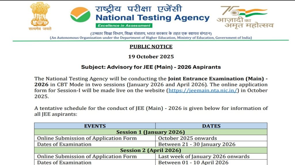 नॅशनल टेस्टिंग एजन्सी 21 ते 30 जानेवारी 2026 दरम्यान जेईई मेन्स 2026 फेज 01 परीक्षा आणि 1 ते 10 एप्रिल 2026 दरम्यान फेज 2 परीक्षा आयोजित करेल.