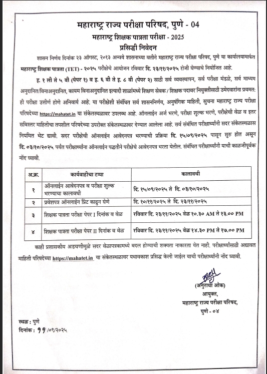 महाराष्ट्र राज्य परीक्षा परिषद 23 नोव्हेंबर रोजी महाराष्ट्रातील विविध परीक्षा केंद्रांवर MAHA TET 2025 परीक्षा घेणार आहे. यासोबतच 10 नोव्हेंबर रोजी प्रवेशपत्रे जारी केली जातील. ही परीक्षा दोन सत्रांमध्ये घेतली जाईल. इयत्ता पहिली ते पाचवीची परीक्षा सकाळी 10:30 ते दुपारी 1 आणि इयत्ता सहावी ते आठवीची परीक्षा दुपारी 2:30 ते सायंकाळी 5 या वेळेत घेतली जाईल.