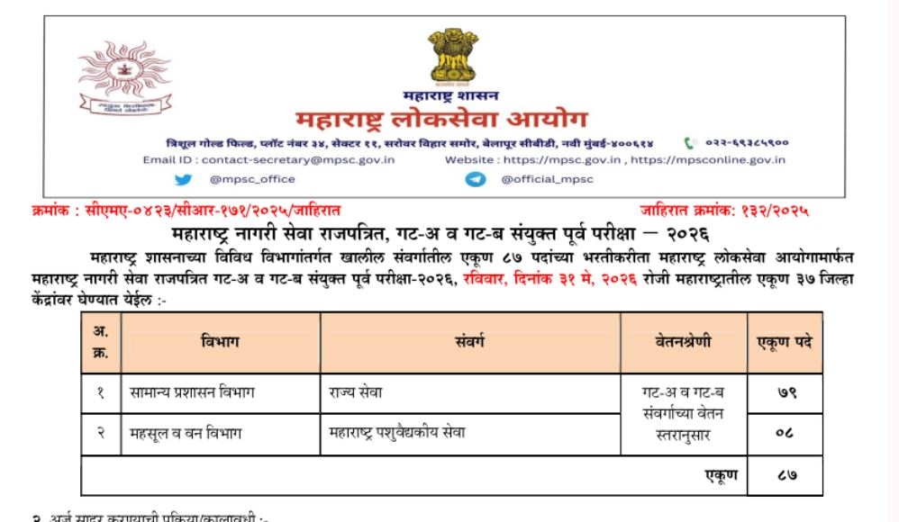मुंबई. Maharashtra Rajyaseva 2026: महाराष्ट्र लोकसेवा आयोग (MPSC) ने mpsc.gov.in वर महाराष्ट्र राज्य सेवा 2026 अधिसूचना जारी केली. MPSC राज्यसेवा गट अ आणि ब पदांसाठी सहाय्यक संचालक, सहाय्यक गट विकास अधिकारी आणि इतर पदांसाठी एकूण 87 रिक्त जागा जाहीर करण्यात आल्या आहेत. ऑनलाइन अर्ज प्रक्रिया 31 डिसेंबर 2025 रोजी सुरू होईल.