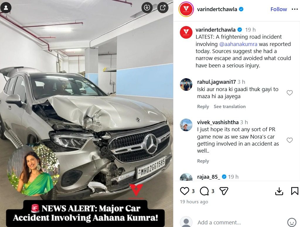 तथापि, अपघात कुठे झाला हे स्पष्ट नाही. अभिनेत्रीने अद्याप सोशल मीडियावर अपघाताबद्दल कोणतीही माहिती शेअर केलेली नाही. वरिंदर चावला नावाच्या एका पापाराझी पेजने आहानाच्या अपघातग्रस्त कारचा फोटो ऑनलाइन शेअर केला आहे. कामाच्या बाबतीत, अभिनेत्री अलीकडेच "राईज अँड फॉल" या रिअॅलिटी मालिकेतील तिच्या सहभागामुळे चर्चेत आहे. शोमधील तिच्या कामगिरीने लक्ष वेधले, विशेषतः सहकारी स्पर्धक पवन सिंगसोबत झालेल्या तिच्या भांडणाने. त्यानंतर आहानाने उघड केले की तिला पवन सिंगच्या चाहत्यांकडून यामुळे जीवे मारण्याच्या धमक्या मिळाल्या. अभिनेत्रीने देखील पुष्टी केली की तिने शोच्या निर्मात्यांकडे हा मुद्दा उपस्थित केला आहे आणि तिच्या सुरक्षिततेबद्दल चिंता व्यक्त केली आहे.