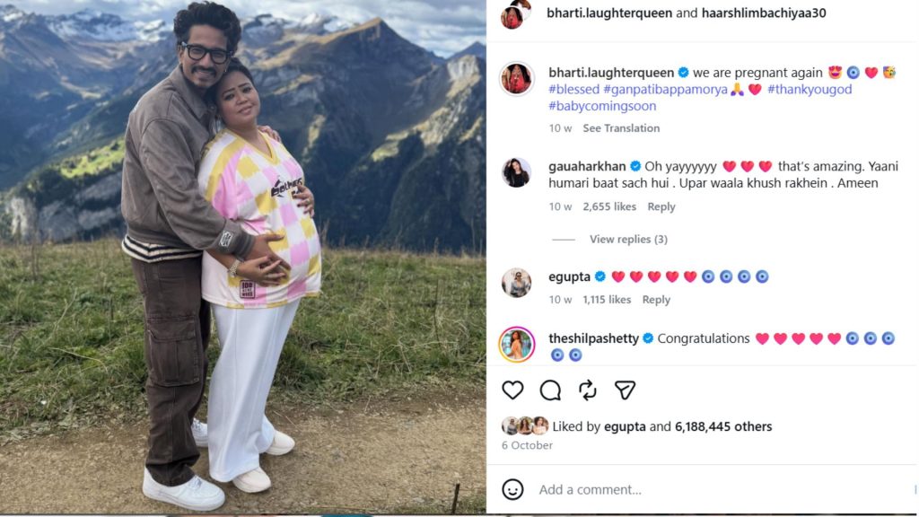 भारती आणि हर्षने सप्टेंबरमध्ये स्वित्झर्लंडमध्ये कौटुंबिक सुट्टीदरम्यान त्यांच्या दुसऱ्या गरोदरपणाची घोषणा केली. ते 2022 मध्ये पहिल्यांदाच पालक झाले होते.