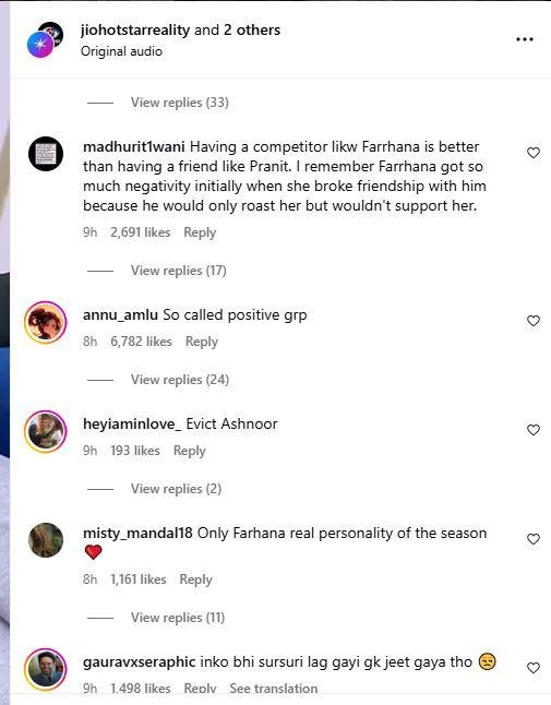 हा व्हायरल व्हिडिओ आणि सकारात्मक गटातील फूट पाहून सोशल मीडिया वापरकर्ते त्यांच्या प्रतिक्रिया व्यक्त केल्याशिवाय राहू शकले नाहीत. एका वापरकर्त्याने लिहिले की, "या तिघांपैकी फक्त जीके चांगला आहे; हा जाजू आणि अशनूरमधील खेळ नाही." दुसऱ्या वापरकर्त्याने लिहिले की, "फरहानासारखी स्पर्धक प्रणित मोरेसारख्या मित्रापेक्षा खूपच चांगली आहे. फरहाना प्रणितसोबत असताना खूप नकारात्मक होती. तो फक्त भाजतो, तो मैत्रीला पाठिंबा देत नाही."
