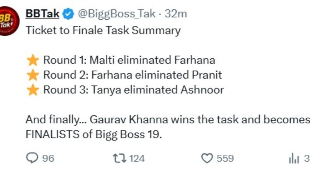 बिग बॉस अपडेट पेजनुसार, गौरव खन्ना या टास्कचा विजेता ठरला. हो, गौरव खन्ना हा शोच्या अंतिम फेरीत पोहोचणारा पहिला स्पर्धक आहे.