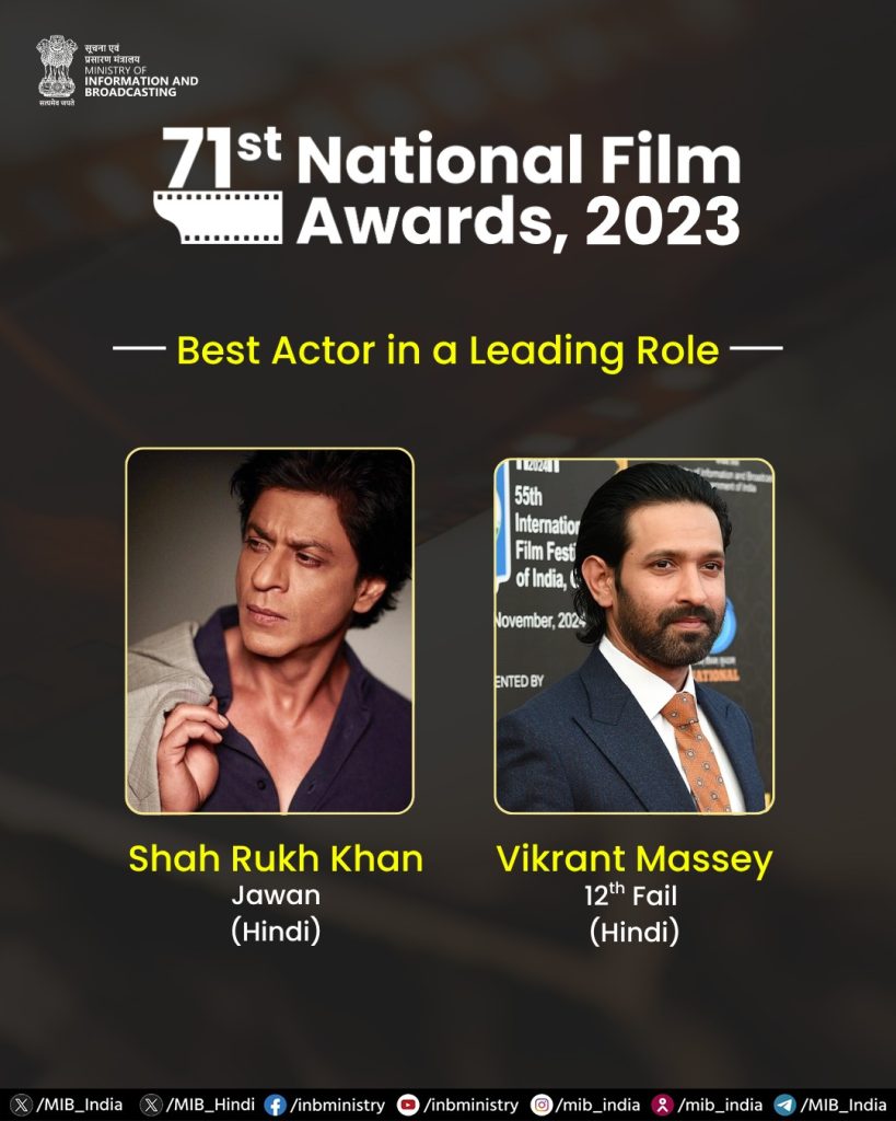 - सर्वोत्कृष्ट अभिनेता - शाहरुख खान (जवान) आणि विक्रांत मेस्सी (12वी फेल)