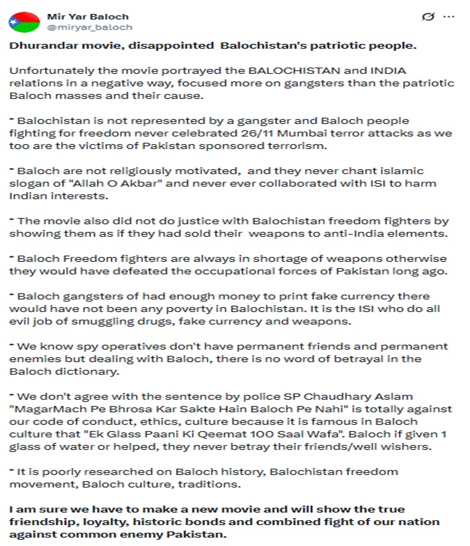 कॅप्शनमध्ये मीर यार यांनी लिहिले की, "बलुच धार्मिकदृष्ट्या प्रेरित नाहीत आणि ते कधीही 'अल्लाह ओ अकबर' चा इस्लामिक नारा देत नाहीत आणि भारतीय हितसंबंधांना हानी पोहोचवण्यासाठी कधीही आयएसआयशी सहकार्य करत नाहीत. या चित्रपटात बलुचिस्तानच्या स्वातंत्र्यसैनिकांना असे दाखवून न्याय देण्यात आला नाही की जणू काही त्यांनी त्यांची शस्त्रे भारतविरोधी घटकांना विकली आहेत.