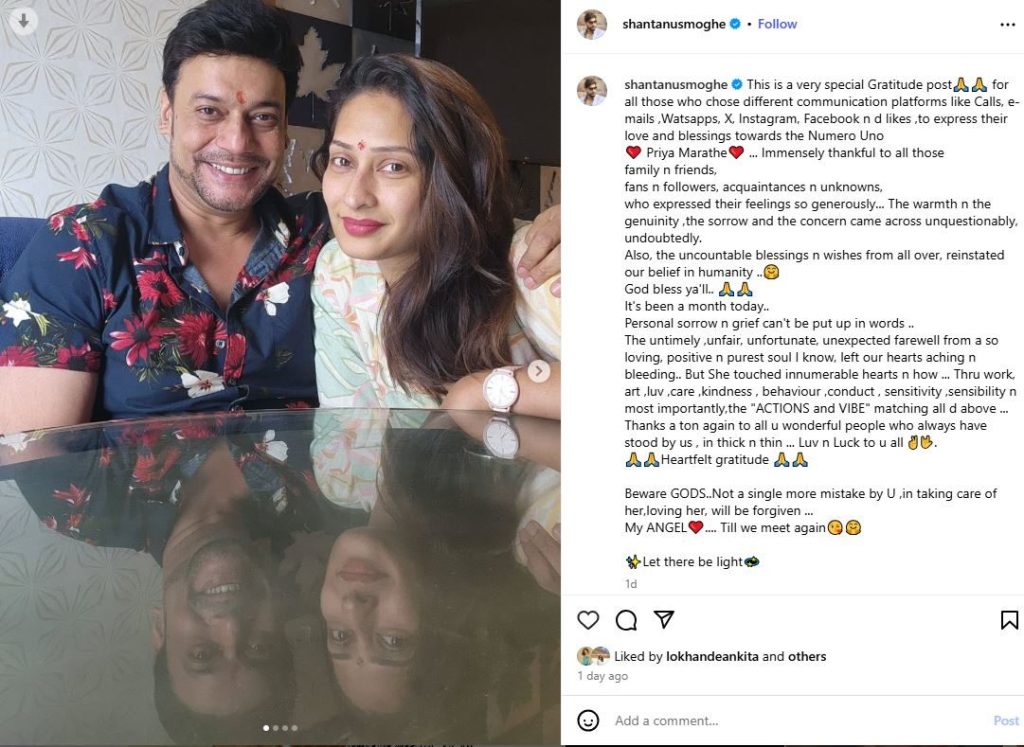 शंतनूने त्यांच्या अधिकृत इंस्टाग्राम अकाउंटवर प्रिया मराठे आणि त्यांचे अनेक न पाहिलेले आणि गोंडस फोटो शेअर करून त्यांच्या पत्नीची आठवण काढली. त्यांनी कॅप्शनमध्ये लिहिले की, "ही पोस्ट कृतज्ञता व्यक्त करण्यासाठी आहे. विविध प्लॅटफॉर्मद्वारे प्रिया मराठेबद्दल प्रेम आणि आशीर्वाद व्यक्त करणाऱ्या प्रत्येकाचे मी मनापासून आभार मानतो."