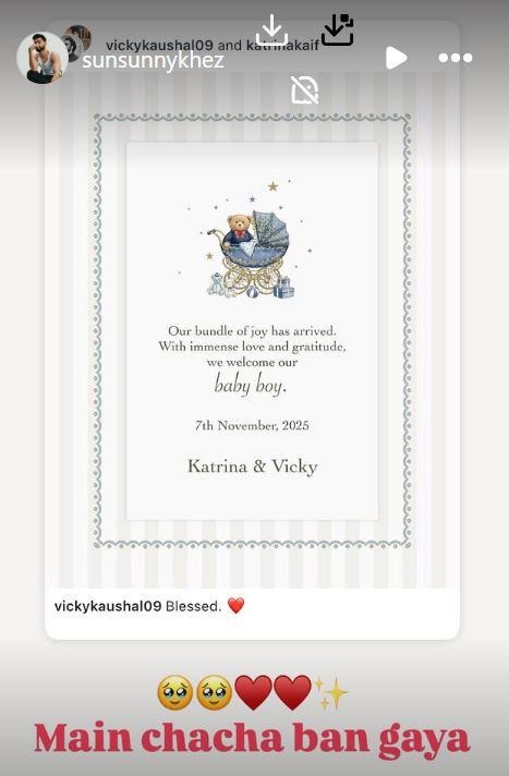 सनी कौशल आता काका झाला आहे. अभिनेत्याने विकी आणि कतरिनाची पोस्ट पुन्हा शेअर केली आणि काका झाल्याचा आनंद व्यक्त केला. त्याने कॅप्शनमध्ये लिहिले, "मी काका झालो."