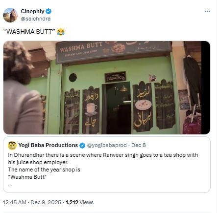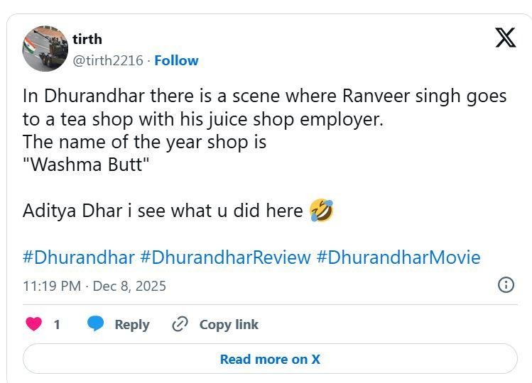 एका वापरकर्त्याने लिहिले, "धुरंधरमध्ये वाश्मा बटच्या दुकानाचा बोर्ड कोणी पाहिला का? मी हसून लोळत होतो." दुसऱ्या वापरकर्त्याने लिहिले, "धुरंधरमध्ये एक दृश्य आहे जिथे रणवीर सिंग एका चहाच्या दुकानात ज्यूस स्टॉल चालवणाऱ्या माणसासोबत जातो. दुकानाचे नाव 'वाश्मा बट' आहे. आदित्य धर, तू इथे काय केलेस ते आम्ही पाहिले."