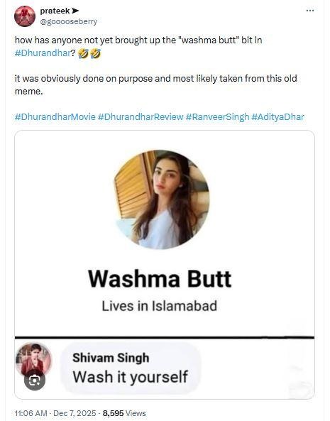 आदित्य धरने धुरंधरमध्ये एक दृश्य चित्रित केले आहे जिथे मोहम्मद आलम (गौरव गेरा) हमजाला पाकिस्तानी बिर्याणी आणि चहाच्या दुकानात चहासाठी आमंत्रित करतो. दुकानात प्रवेश करताच, आदित्य धर कॅमेरा एका बॅनरकडे वळवतो ज्यावर लिहिलेले असते, "वाश्मा बट बिर्याणी आणि चहाची दुकान". या पोस्टमुळे लोकांमध्ये गोंधळ उडाला आहे आणि "वाश्मा बट" नावाने एक जुना मीम परत आणला आहे, ज्याने इंटरनेटवर धुमाकूळ घातला आहे. खाली वाश्मा बटबद्दल वाचा: