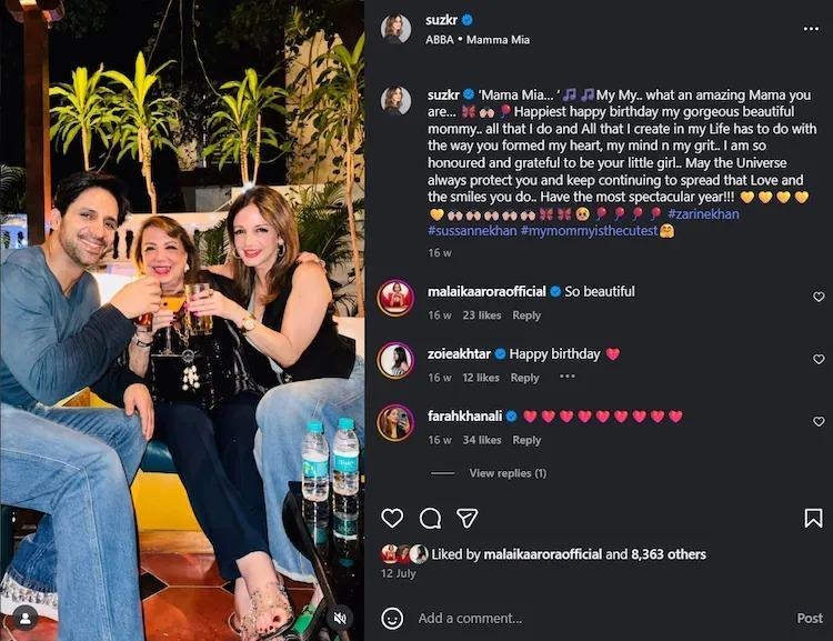या वर्षी जुलैमध्ये सुझान खानने तिचा 81 वा वाढदिवस साजरा केला. तिने तिच्या आई जरीन आणि कुटुंबातील इतर सदस्यांसोबत घालवलेल्या क्षणांचा व्हिडिओ इन्स्टाग्रामवर शेअर केला. व्हिडिओसोबत सुझानने लिहिले, "मम्मा मिया. तू किती अद्भुत आई आहेस माझी आई. माझी सुंदर, सुंदर आई, तुला वाढदिवसाच्या खूप खूप शुभेच्छा. मी जे काही करते आणि माझ्या आयुष्यात मी जे काही निर्माण करते ते तू माझ्या हृदयाला, माझ्या मनाला आणि माझ्या धैर्याला कसे आकार दिले आहे याच्याशी जोडलेले आहे. मी तुझी लहान मुलगी असल्याचा मला खूप अभिमान आणि कृतज्ञता आहे. विश्व नेहमीच तुझे रक्षण करो आणि तुझे प्रेम आणि हास्य पसरवत राहो. हे वर्ष खूप छान जावो!!!"
