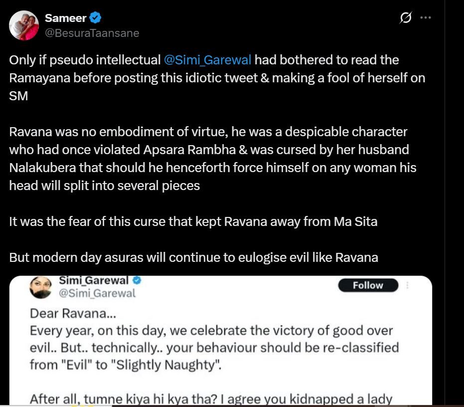 एका युजरने तिच्या पोस्टवर नाराजी व्यक्त केली आणि म्हटले की, "मला वाटते की ही बनावट बुद्धिमत्ता सिमी गरेवालने हे मूर्ख ट्विट पोस्ट करण्यापूर्वी आणि सोशल मीडियावर स्वतःला मूर्ख बनवण्यापूर्वी रामायण वाचले असते. रावण चांगला माणूस नव्हता, तो एक नीच माणूस होता ज्याने एकदा अप्सरा रंभासोबत गैरवर्तन केले होते आणि तिचा पती नलकुबरने त्याला शाप दिला होता की जर त्याने भविष्यात कोणत्याही महिलेसोबत असे केले तर त्याचे डोके अनेक तुकडे होईल. या शापामुळेच रावण माता सीतेकडे गेला नाही परंतु आजचे राक्षस रावणासारख्या वाईट लोकांची स्तुती करत राहतात."