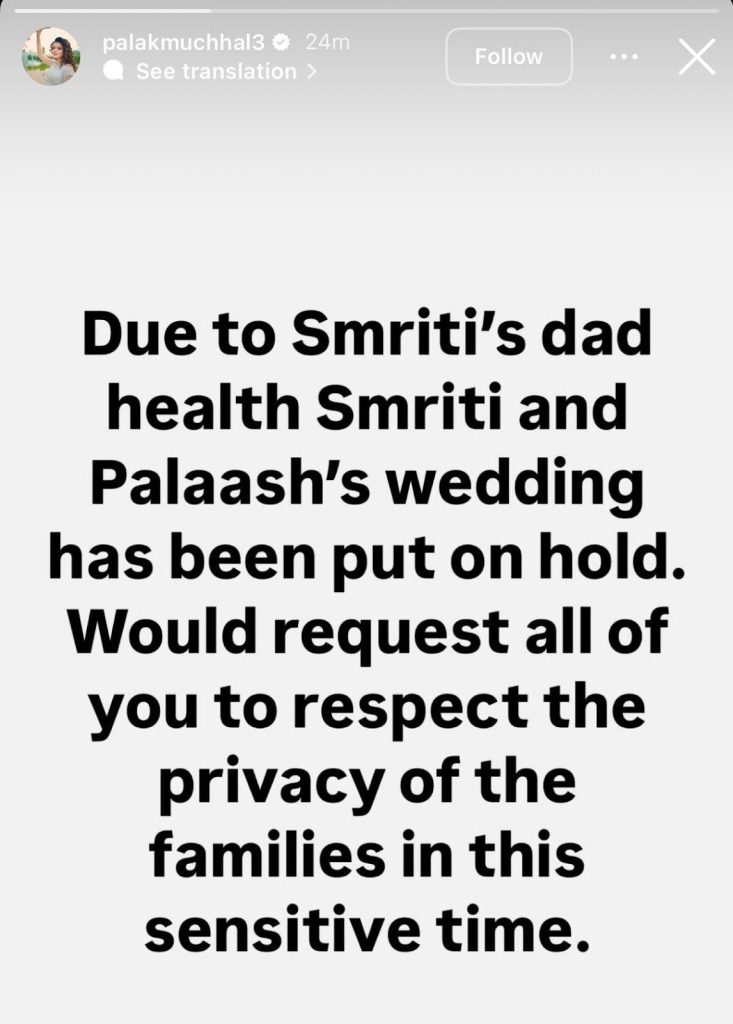 दरम्यान, वराची बहीण आणि गायिका पलक मुच्छल यांनी सोशल मीडियावर एक निवेदन जारी केले. तिने तिच्या इंस्टाग्राम स्टोरीमध्ये लिहिले की, "स्मृतीच्या वडिलांच्या प्रकृतीमुळे, स्मृती आणि पलाश यांचे लग्न सध्यासाठी पुढे ढकलण्यात आले आहे. या कठीण काळात आम्ही सर्वांना आमच्या गोपनीयतेचा आदर करण्याची विनंती करतो."