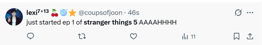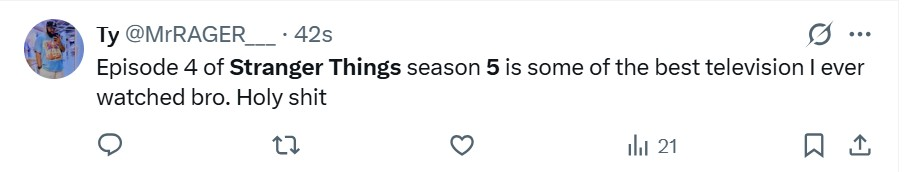एका वापरकर्त्याने त्याच्या एक्स हँडलवर स्ट्रेंजर थिंग्ज 5 बद्दल ट्विट केले आणि लिहिले - मी नुकताच स्ट्रेंजर थिंग्ज सीझन 5 चा पहिला एपिसोड, द क्रॉल, खरे सांगायचे तर, हाहा, तो मजेदार होता.