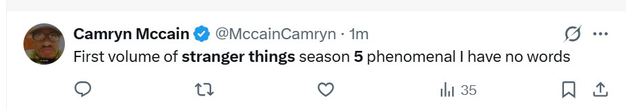 दरम्यान, लोकांनी सोशल मीडिया हँडल X वर स्ट्रेंजर थिंग्ज 5 व्हॉल्यूम 1 वर त्यांच्या प्रतिक्रिया पोस्ट करण्यास सुरुवात केली आहे. तर, स्ट्रेंजर थिंग्ज 5 च्या एक्स पुनरावलोकनांमध्ये काय म्हटले आहे ते जाणून घेऊया.