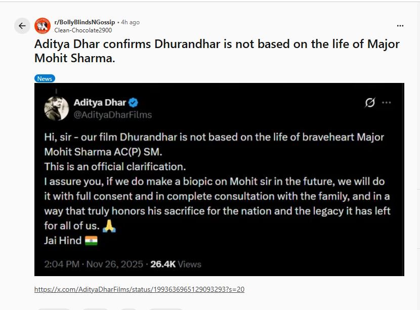 खरं तर, मेजर मोहित शर्मा यांचे भाऊ मधुर शर्मा यांनी एका माजी कथेवर प्रतिक्रिया दिली, ज्यामध्ये असे सुचवण्यात आले की "धुरंधर" हा चित्रपट अधिकाऱ्याच्या प्रेरणादायी जीवनावर आधारित असू शकतो. या दाव्यांवर प्रतिक्रिया देताना, गुप्तहेर अॅक्शन थ्रिलरचे दिग्दर्शक आदित्य धर यांनी माजी कथेवर प्रतिक्रिया देताना लिहिले की, "आमचा चित्रपट 'धुरंधर' हा शूर मेजर शर्मा यांच्या जीवनावर आधारित नाही. हे अधिकृत विधान आहे."