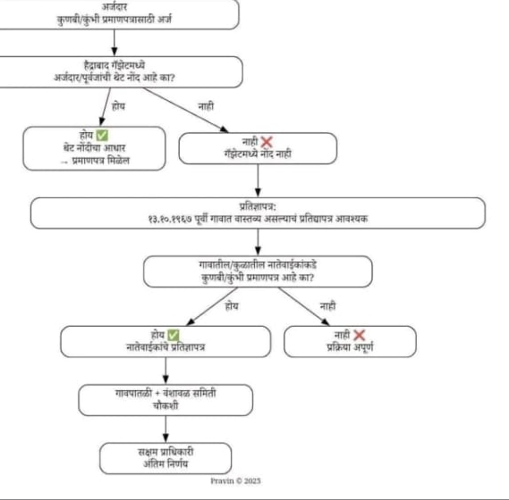 - मात्र जर हैदराबाद गॅझेटमध्ये नोंद नसल्यास 13-10-1967 पूर्वी गावात वास्तव्य असल्याचे प्रतिज्ञापत्र सादर करावं लागेल. गावातील भावकी व रक्ताच्या नात्यातील नातेवाईकांकडे कुणबी प्रमाणपत्र असल्यास ते जोडावे लागेल, हे प्रमाणपत्र नसल्यास तुमच्या अर्जाची प्रक्रिया तेथेच थांबेल.