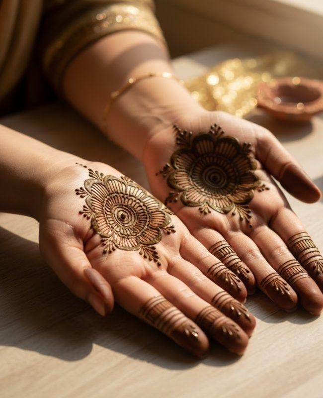 जर तुम्ही मिनिमलिस्ट मेहंदीचे चाहते असाल आणि अशाच प्रकारची डिझाईन शोधत असाल, तर ही डिझाईन तुमच्यासाठी परिपूर्ण असेल. तुमच्या हाताच्या मध्यभागी असलेली फुलांची डिझाईन आणि ट्रेंडी बोटांची डिझाईन तुम्हाला खरोखरच उत्सवी लूक देतील आणि तुमचे सौंदर्य वाढवतील.