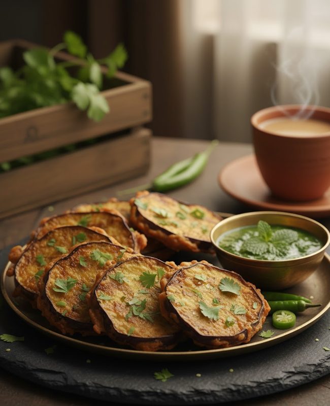 वांग्याचे पातळ काप मसालेदार बेसनाच्या पिठात बुडवून कुरकुरीत होईपर्यंत तळले जातात. खिचडी किंवा चहासोबत ते अप्रतिम लागते.