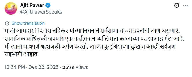 माजी आमदार विश्वास नांदेकर यांच्या निधनानं सर्वसामान्यांच्या प्रश्नांची जाण असणारं, सामाजिक बांधिलकी जपणारं एक कर्तृत्ववान व्यक्तिमत्व काळाच्या पडद्याआड गेलंय. माजी आमदार नांदेकर यांना भावपूर्ण श्रद्धांजली अर्पण करतो, अशा शब्दांत उपमुख्यमंत्री अजित पवार यांनी त्यांना श्रद्धांजली वाहिली.