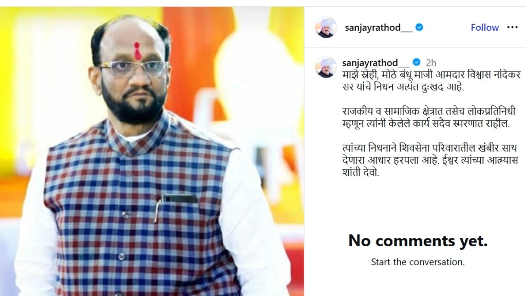 माझे स्नेही, मोठे बंधू माजी आमदार विश्वास नांदेकर सर यांचे निधन अत्यंत दुःखद आहे. राजकीय व सामाजिक क्षेत्रात तसेच लोकप्रतिनिधी म्हणून त्यांनी केलेले कार्य सदैव स्मरणात राहील. त्यांच्या निधनाने शिवसेना परिवारातील खंबीर साथ देणारा आधार हरपला आहे, अशी शोकभावना मंत्री संजय राठोड यांनी व्यक्त केली आहे.