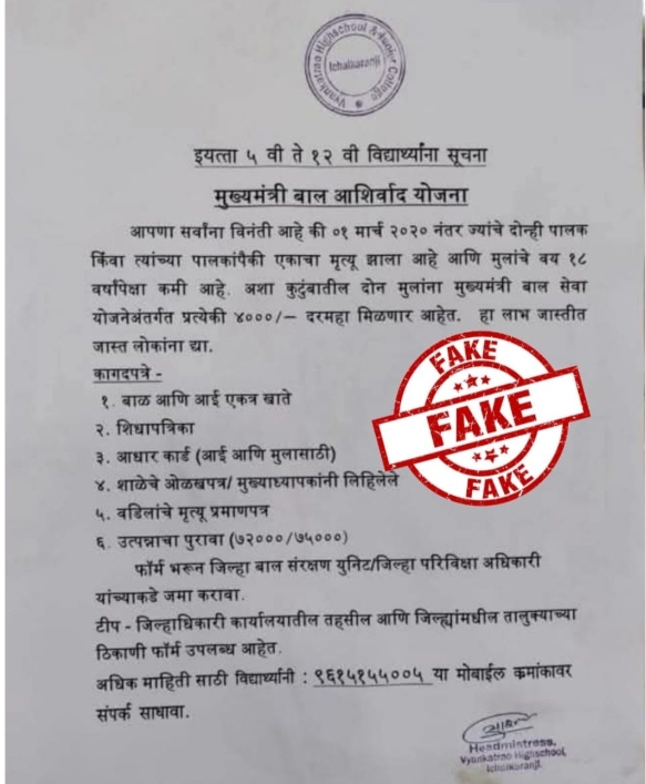 महाराष्ट्रात शालेय शिक्षण विभागाअंतर्गत ‘मुख्यमंत्री बाल आशीर्वाद योजना’ अशा नावाची कोणतीही योजना अस्तित्वात नाही. त्यामुळे, व्हायरल झालेल्या पोस्टमधील सर्व दावे हे खोटे ठरतात. व्हायरल नोटीसवर कोल्हापूरच्या इचलकरंजी येथील वेंकटराव हायस्कूलच्या मुख्याध्यापिका यांची स्वाक्षरी आहे. शाळेच्या मुख्याध्यापिका यांनी हा संदेश खोटा असल्याचे स्पष्ट केले आहे, असं माहिती संचालनालयाकडून सांगण्यात आलं आहे.