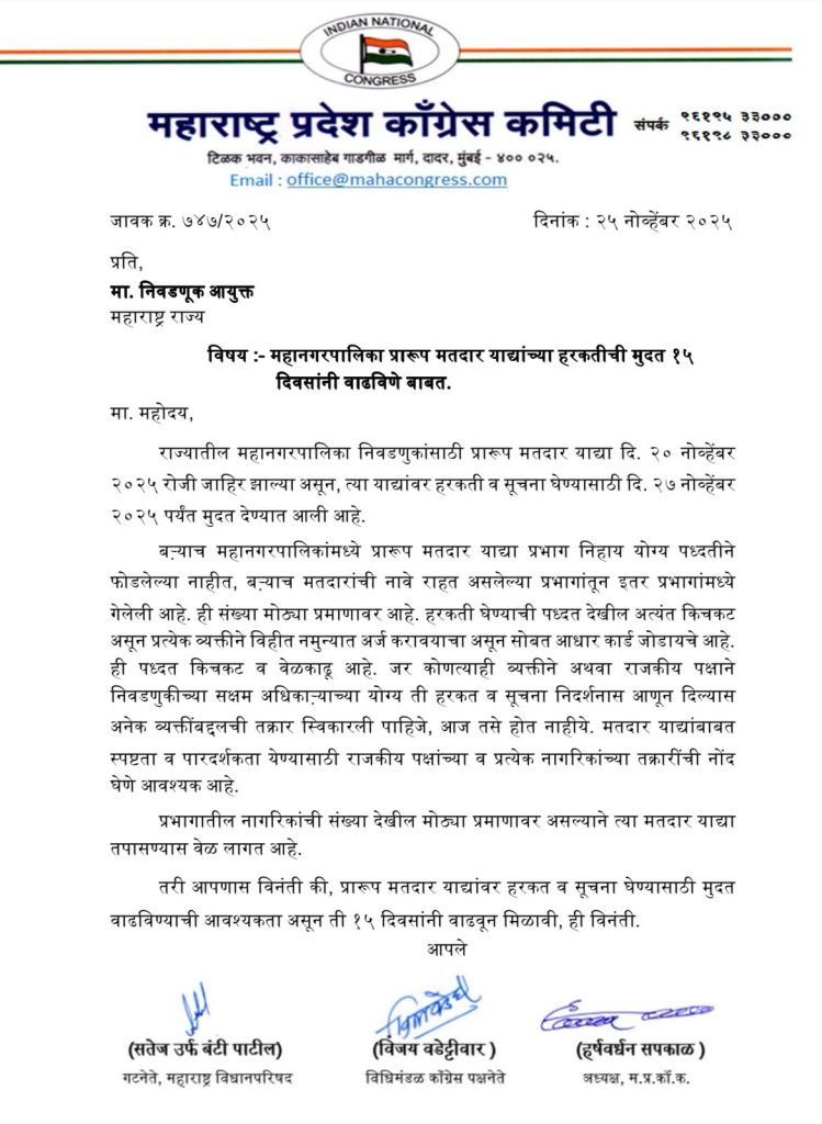 जेएनएन, मुंबई: राज्यातील महानगरपालिका निवडणुकांसाठी (Maharashtra municipal corporation elections) प्रारुप मतदार यादी 20 नोव्हेंबर 2025 रोजी जाहिर झाली असून या याद्यांवर हरकती व सूचना घेण्यासाठी 27 नोव्हेंबर 2025 पर्यंतची मुदत देण्यात आली आहे. बऱ्याच महानगरपालिकांमध्ये प्रारुप मतदार याद्यांवर हरकत व सूचना घेण्यासाठी मुदत वाढविण्याची आवश्यकता असून अवघी 7 दिवसांची मुदत अत्यंत कमी आहे, ती 15 दिवसांनी वाढवून द्यावी, अशी मागणी महाराष्ट्र प्रदेश काँग्रेस कमिटीने केली आहे.
