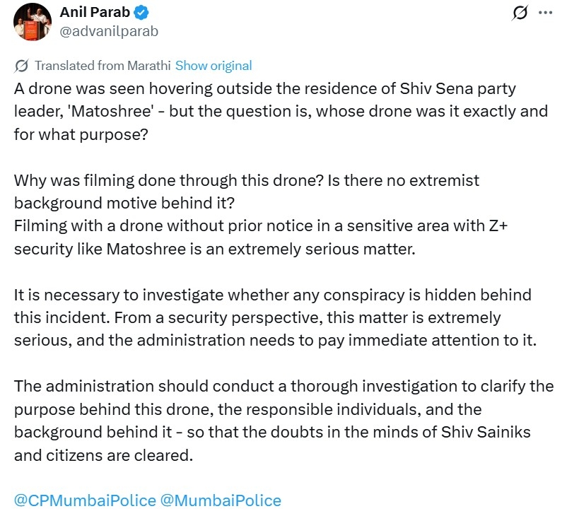 मुंबईतील वांद्रे येथील मातोश्री हा अत्यंत सुरक्षित परिसर आहे हे लक्षात घेतले पाहिजे. अनिल परब यांनी ड्रोन वापरून घराचे चित्रीकरण केल्याचा दावा केला आहे. ते म्हणतात की, उच्च सुरक्षा क्षेत्रात परवानगीशिवाय ड्रोनचा प्रवेश करणे ही अत्यंत गंभीर बाब आहे.