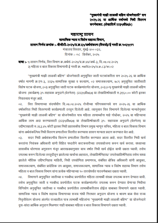 जेएनएन, मुंबई. महायुती सरकारने राज्यातील मुख्यमंत्री माझी लाडकी बहिण योजनेतील लाभार्थ्यांना (Ladki Bahin Yojan) मोठी खुशखबर दिली आहे. लाडकी बहीण योजनेचा नोव्हेंबरचा हप्ता लवकरच लाभार्थी महिलांच्या खात्यात जमा होणार आहे. (Ladki Bahin Yojana October Installment) आहे. यासाठी लागणारा 263.45 कोटी रुपयांचा निधी हा महिला आणि बाल कल्याण विभागाच्या खात्यात वर्ग करण्यात आला आहे.