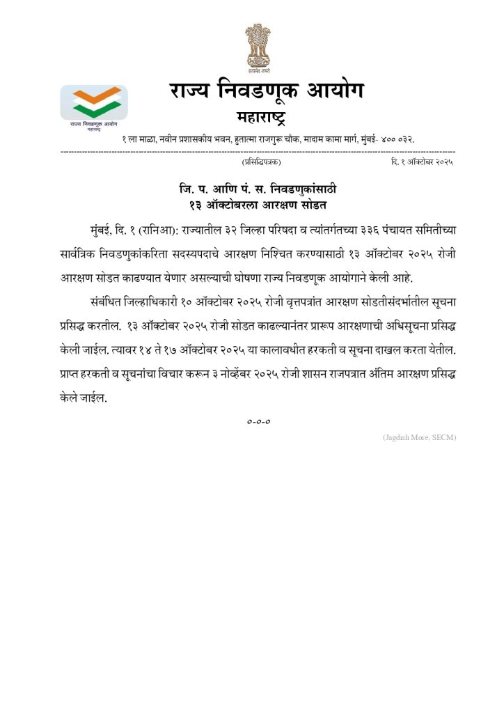 राज्य निवडणूक आयोग, महाराष्ट्र राज्य मार्फत जिल्हा परिषद आणि पंचायत समिती निवडणुकांसाठी १३ ऑक्टोबर २०२५ रोजी आरक्षण सोडत काढण्यात येणार आहे.