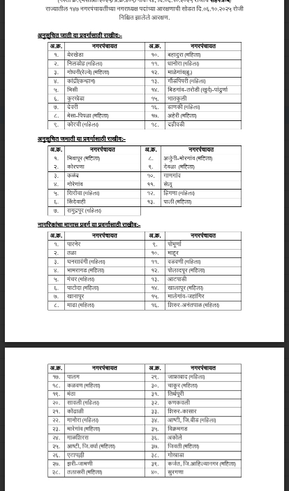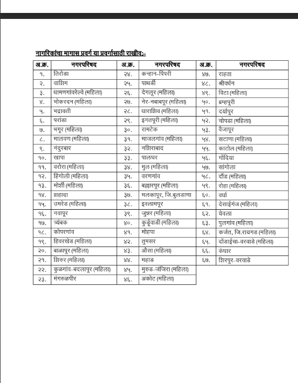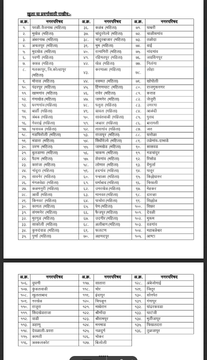 भगूर - ओबीसी महिला, इगतपुरी - ओबीसी महिला, विटा - ओबीसी महिला, बल्हारपूर - ओबीसी महिला, धाराशिव - ओबीसी महिला, भोकरदन - ओबीसी महिला, जुन्नर - ओबीसी महिला, उमरेड - ओबीसी महिला, दौंड - ओबीसी महिला, कुळगाव बदलापूर - ओबीसी महिला, हिंगोली - ओबीसी महिला, फुलगाव - ओबीसी महिला, मुरुड जंजीरा - ओबीसी महिला, शिरूर - ओबीसी महिला, काटोल - ओबीसी महिला, माजलगाव - ओबीसी महिला, मूल - ओबीसी महिला, मालवण - ओबीसी महिला, देसाईगंज - ओबीसी महिला, हिवरखेड - ओबीसी महिला, अकोट - ओबीसी महिला, मोर्शी - ओबीसी महिला, नेर- नवाबपूर - ओबीसी महिला, औसा - ओबीसी महिला, कर्जत - ओबीसी महिला, देगलूर - ओबीसी महिला, चोपडा - ओबीसी महिला, सटाणा- ओबीसी महिला, दोंडाईचा वरवडे - ओबीसी महिला, बाळापूर - ओबीसी महिला, रोहा - ओबीसी महिला, कुरडुवादी - ओबीसी महिला, धामणगावरेल्वे - ओबीसी महिला, वरोरा - ओबीसी महिला,