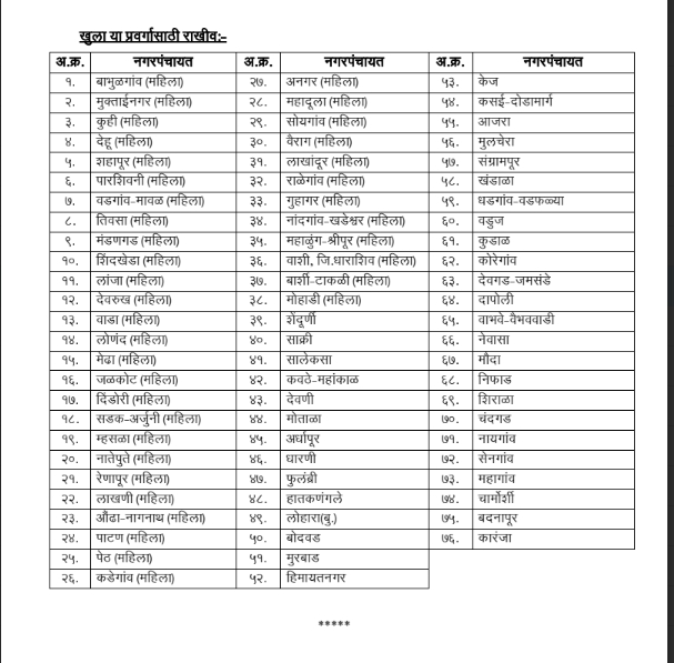 मोहडी- खुला महिला, बार्शी टाकळी- खुला महिला, वाशी- खुला महिला, म्हाळुंगा श्रीपूर- खुला महिला, नांदगाव खंडेश्वर- खुला महिला, गुहागर- खुला महिला, राळेगाव- खुला महिला, लाखांदूर - खुला महिला, वैराग- खुला महिला, सोयगाव - खुला महिला, महादूला- खुला महिला, अनगर- खुला महिला, कडेगाव- खुला महिला, पेठ- खुला महिला, पाठण- खुला महिला, औंढा नागनाथ- खुला महिला, लाखनी - खुला महिला, रेणापूर- खुला महिला, नातेपुते- खुला महिला, म्हसळा - खुला महिला, सडक अर्जुनी- खुला महिला, दिंडोरी- खुला महिला, जळकोट - खुला महिला, मेढा - खुला महिला, लोणंद- खुला महिला, वाडा- खुला महिला, देवरुख- खुला महिला, लांजा - खुला महिला, सिंदखेडा- खुला महिला, मंडणगड- खुलासा महिला, तिवसा- खुला महिला, वडगाव मावळ- खुला महिला, पारशिवनी- खुला महिला, शहापूर - खुला महिला, देहू- खुला महिला, कुही- खुला महिला, मुक्ताईनगर- खुला महिला, बाभुळगाव- खुला महिला,
