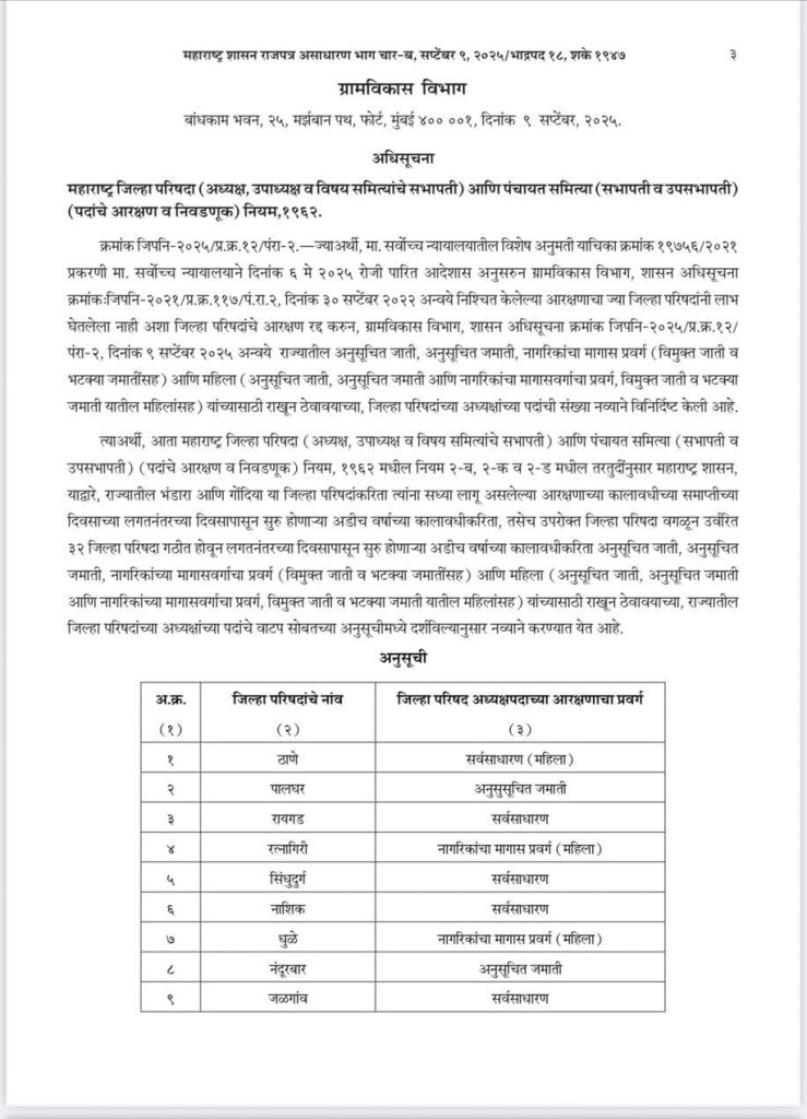 9 सप्टेंबर 2025 रोजी महाराष्ट्र शासनाने जारी केलेल्या या आदेशानुसार, राज्यातील एकूण 34 जिल्हा परिषदा अध्यक्षपदांसाठी अनुसूचित जाती, अनुसूचित जमाती, मागास प्रवर्ग (OBC), महिला व सर्वसाधारण प्रवर्ग अशा विविध वर्गवारीतून आरक्षण ठरविण्यात आले आहे.