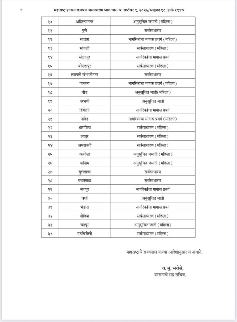 नागरिकांचा मागास प्रवर्ग (OBC) साठी रत्नागिरी (महिला), धुळे (महिला), सातारा (महिला), सोलापूर, जालना (महिला), नांदेड, धाराशिव (महिला), नागपूर आणि भंडारा या जिल्ह्यांचा समावेश करण्यात आला आहे.