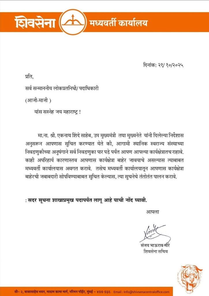 पक्ष प्रमुख एकनाथ शिंदे यांनी स्पष्ट केले आहे की — “पक्षाचा प्रत्येक कार्यकर्ता निवडणूक काळात आपल्या मतदारसंघातच राहील. अपरिहार्य कारणास्तव बाहेर जावं लागल्यास त्याची माहिती मध्यवर्ती कार्यालयात कळवावी. शाखा प्रमुख, नगरसेवक, माजी नगरसेवक, आमदार, खासदार आणि पदाधिकारी यांनी ही जबाबदारी गंभीरपणे घ्यावी. हा आदेश पक्षातील सर्व संघटनात्मक घटकांना पाठवण्यात आला आहे. स्थानिक स्तरावर त्याची अंमलबजावणी सुरू झाली आहे.