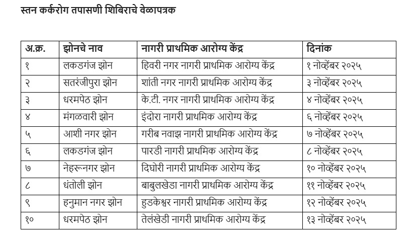 30 वर्षावरील महिलांकरिता हे विशेष स्तन कर्करोग तपासणी शिबिर असून, 13 नोव्हेंबर 2025 पर्यंत झोननिहाय नागरी प्राथमिक आरोग्य केंद्रांमध्ये हे शिबिर घेण्यात येतील. 1 नोव्हेंबरला लकडगंज झोन अंतर्गत हिवरी नगर नागरी प्राथमिक आरोग्य केंद्रामध्ये या शिबिराचा शुभारंभ होईल. सदर शिबिरामध्ये एचसीजी कॅन्सर हॉस्पिटलच्या तज्ञ डॉक्टरांच्या चमूद्वारे तपासणी करण्यात येणार आहे. शिबिराकरिता आवश्यक सहकार्य रोटरी क्लबद्वारे करण्यात येणार आहे.