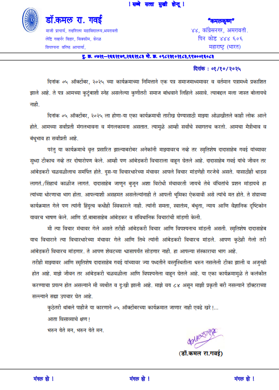 Dr. Kamal Gavai, mother of Chief Justice B.R. Gavai, has clarified that she will not attend the RSS event scheduled in Amravati on October 5, 2025. She expressed pain over false remarks made against her and her late husband, stating their lives have been devoted to Dr. Babasaheb… pic.twitter.com/LRzlbdtVWP