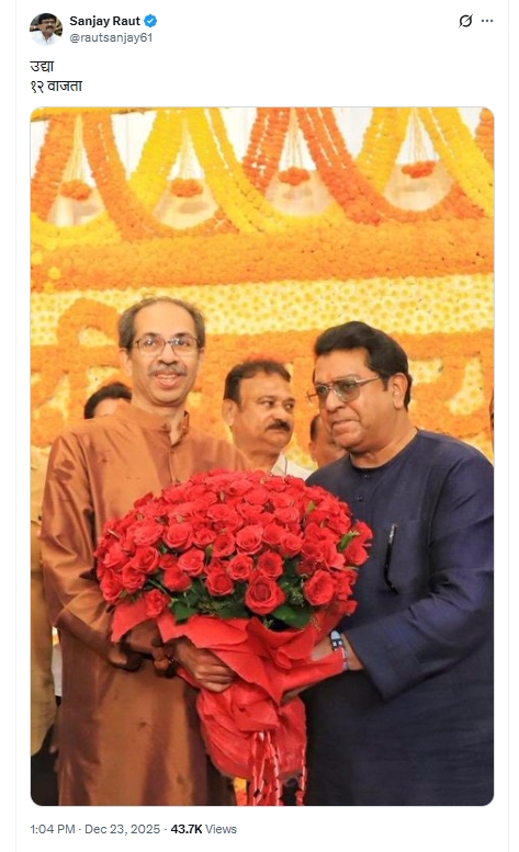 मंगळवारी X वरील एका पोस्टमध्ये राऊत यांनी शिवसेना (UBT) प्रमुख उद्धव ठाकरे आणि त्यांचे भाऊ, मनसे अध्यक्ष राज ठाकरे यांचा फोटो शेअर केला आहे. त्या "उद्या दुपारी 12 वाजता" असे त्यांनी कॅप्शन दिले आहेत.