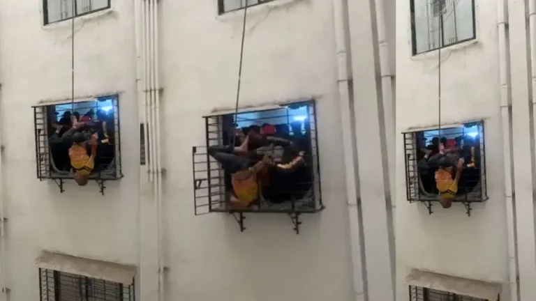 57 वर्षीय नितीनभाई आदिया त्यांच्या घरात खिडकीजवळ झोपले होते तेव्हा झोपेत त्यांनी कूस बदलली आणि पडले. आठव्या मजल्यावरील ग्रिलवर ते अडकले, जिथे त्यांचा पाय अडकला. व्हिडिओमध्ये आदिया उलटे लटकलेले दिसतात, त्यांचा पाय वरच्या ग्रिल बॉक्समध्ये अडकला. याच्या त्यांना प्रचंड वेदनाही होत होत्या. मात्र हे ग्रील त्यांच्यासाठी सुरक्षाकवच ठरले.