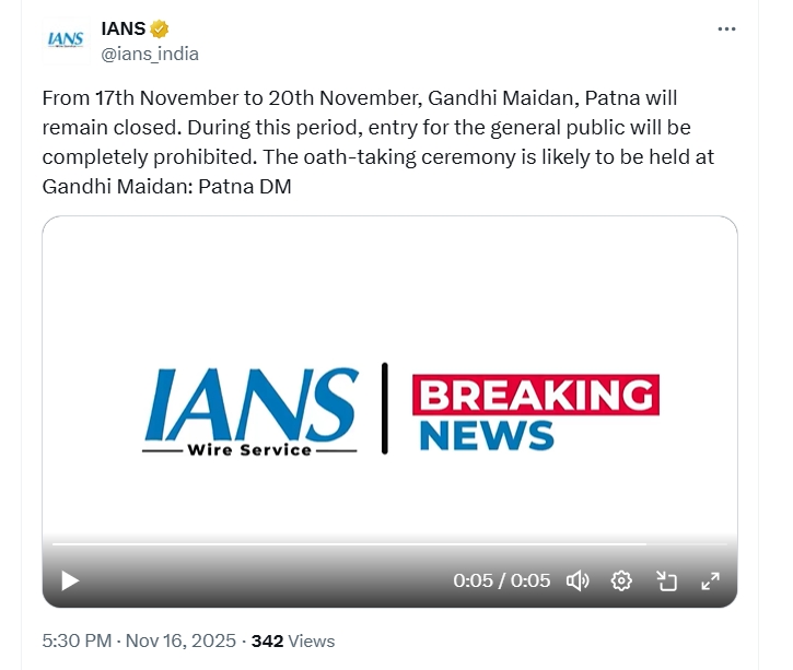 17 नोव्हेंबर ते 20 नोव्हेंबर पर्यंत, गांधी मैदान, पटना बंद राहील. या काळात सर्वसामान्यांना प्रवेश पूर्णपणे बंदी असेल. शपथविधी सोहळा गांधी मैदानावर होण्याची शक्यता आहे, अशी माहिती पाटणा जिल्हाधिकाऱ्यांनी दिली आहे. त्यामुळे येत्या चार दिवसांत शपथ होणार असल्याची चर्चा सुरु आहे.
