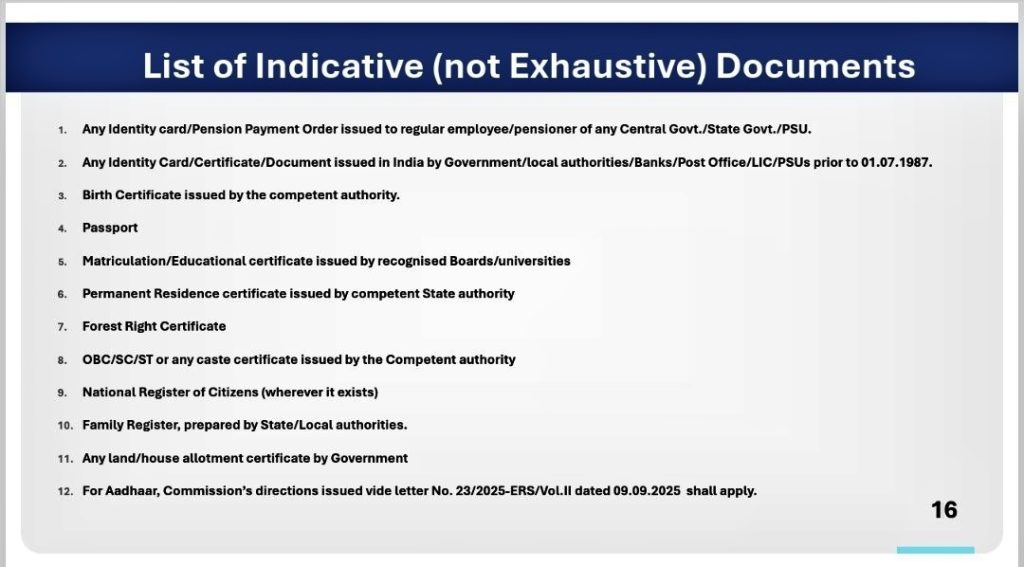 निवडणूक आयोगाने मतदारांनी एसआयआरसाठी सादर कराव्या लागणाऱ्या कागदपत्रांची यादी देखील जारी केली आहे. जर तुमच्याकडे ही कागदपत्रे असतील तर तुम्ही ती तुमच्या बीएलओला दाखवावीत. जे लोक ही कागदपत्रे सादर करत नाहीत त्यांना एसआयआरनंतर तयार केलेल्या मतदार यादीत त्यांची नावे समाविष्ट करण्यात अडचणी येऊ शकतात.