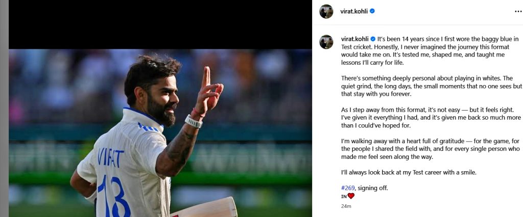 जेएनएन. नवी दिल्ली. Virat Kohli announces Test retirement: भारतीय क्रिकेटर विराट कोहली (Virat Kohli) यांने चाहत्यांना एक धक्का दिला आहे. विराट कोहलीने कसोटी निवृत्तीची घोषणा केली आहे. यापूर्वी भारतीय क्रिकेट संघाचा कर्णधार रोहित शर्मा याने टेस्ट किक्रेटमधून निवृत्तीची घोषणा केली होती.