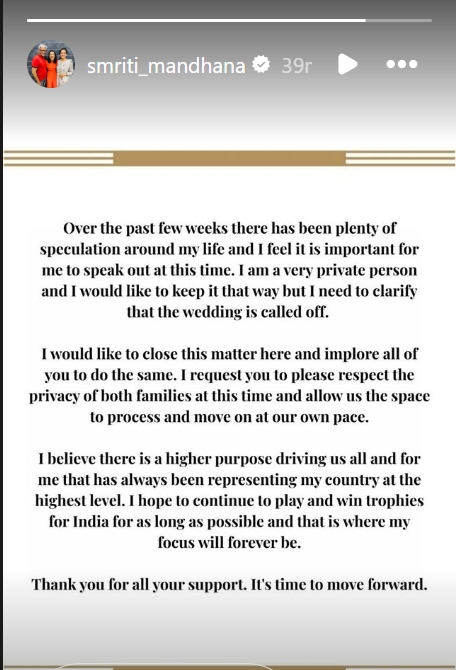 खरंतर, स्मृती मानधनाने तिच्या इंस्टाग्राम अकाउंटवर एक स्टोरी शेअर केली आहे आणि तिचे लग्न रद्द करण्याचा निर्णय घेण्यात आल्याची माहिती दिली आहे. स्मृती मानधनाने तिच्या स्टोरी मध्ये सर्वांना एक आवाहन केलं आहे. ‘दोन्ही कुटुंबांच्या गोपनीयतेचा आदर करा आणि आपल्या भावनांवर प्रक्रिया करण्यासाठी आणि पुढे जाण्यासाठी आम्हाला थोडा वेळ आणि जागा द्या’ असं तिनं म्हटलं आहे.