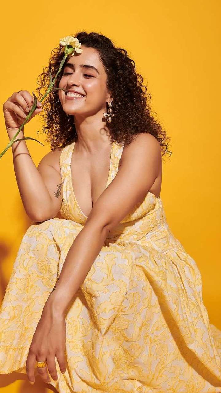 सानिया मल्होत्रा पिवळ्या रंगाच्या ड्रेसमध्ये खूपच सुंदर दिसत आहे, तुम्हालाही सानियाच्या या लूक आवडेल.