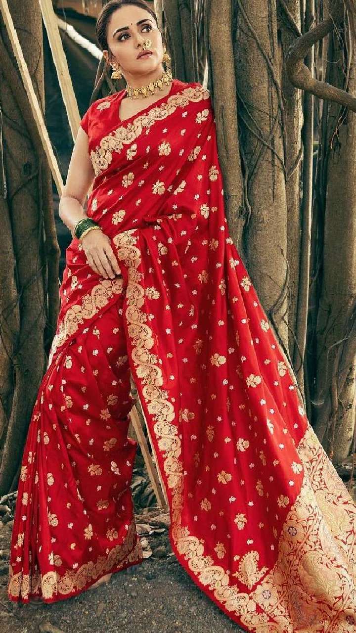 या हस्तकला शाही लाल बनारसी रेशमी साडीसह हस्तकला बनरसी सिल्कची परंपरा दाखवा ही सण आणि सांस्कृतिक कार्यक्रमांसाठी तुमच्यासाठी आदर्श पर्याय आहे.