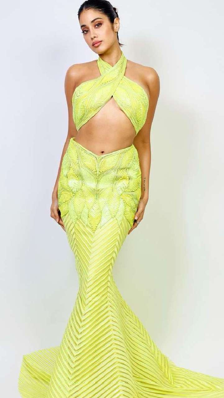 निऑन ग्रीन स्कर्ट सेट इव्हेंट लुकसाठी एक आकर्षक पोशाख आहे. यासोबतच जान्हवीने घातलेले लांब कानातले तिच्या सुंदर लुकमध्ये भर घालतात.