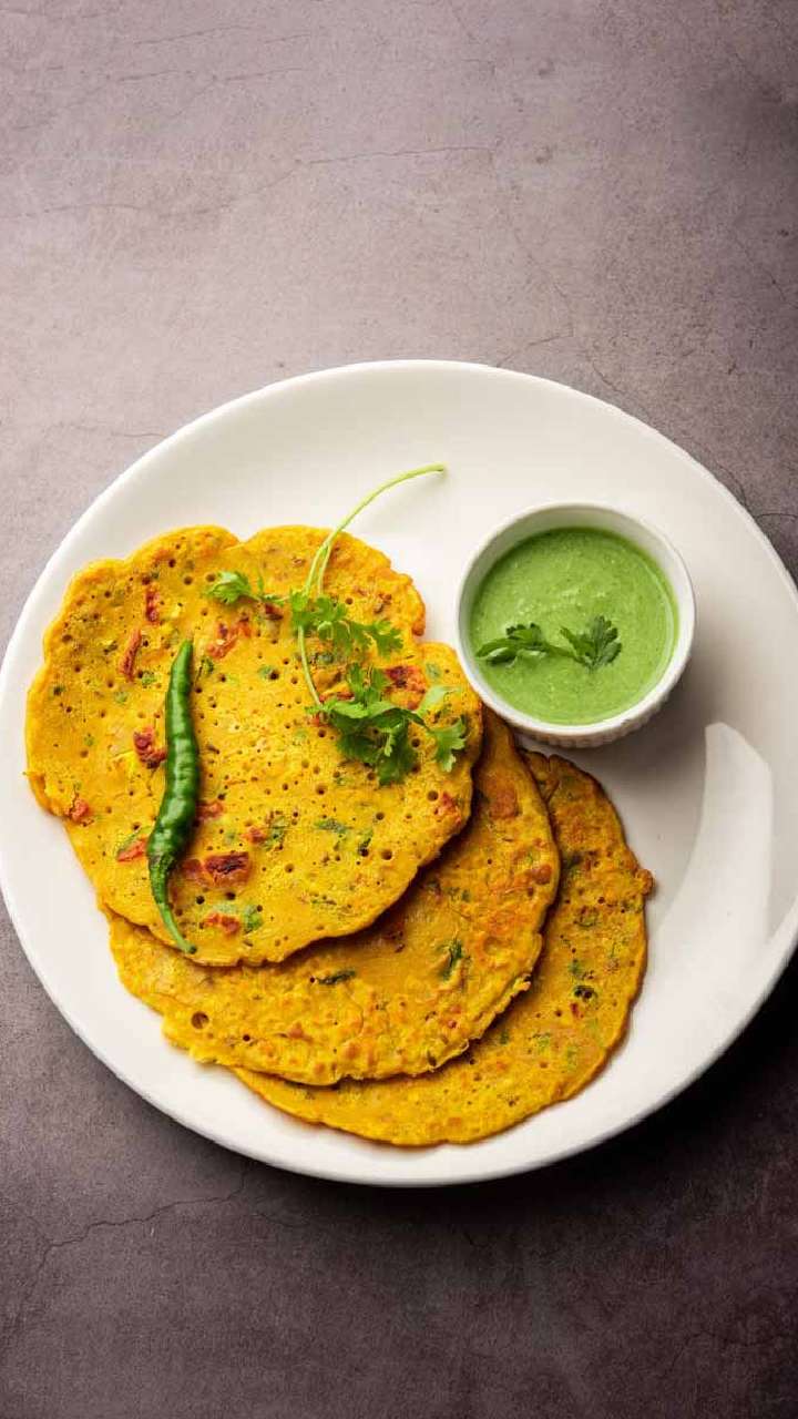 बेसनाचे थालीपीठ थोडासा सांबार घालून सहज बनवता येतो. हिरवी चटणीसोबत गरमागरम खा.