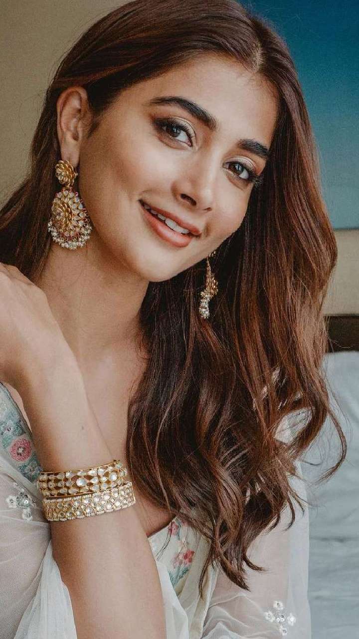 कुंदन स्टडसह पूजा हेगडे अतिशय आकर्षक दिसत आहे. कानातल्यांच्या या खास शैली नेहमीच तुमचे सामान्य रूप सुधारण्यात मदत करते.