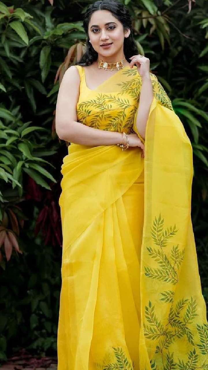 मिया जॉर्जच्या कलेक्शनमधून पिवळ्या बनारसी रेशमी साडीने वाहवाह मिळवली आहे. तुम्ही देखील या द्वारे आनंदी आणि उत्साही लुक मिळवू शकता.